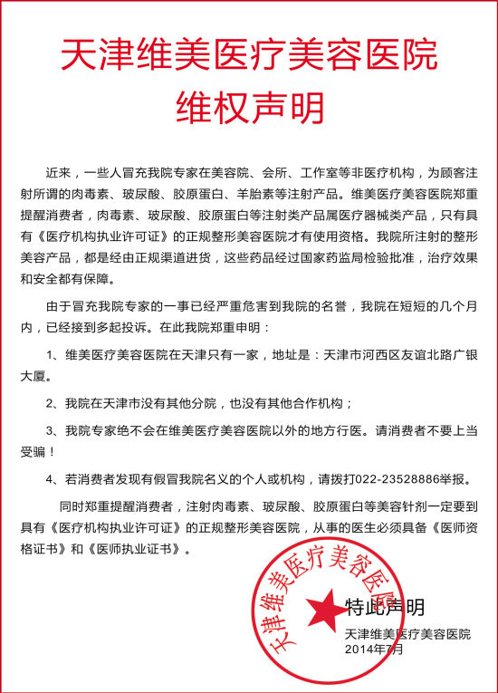 以下是天津维美医疗美容医院维权声明(图)
