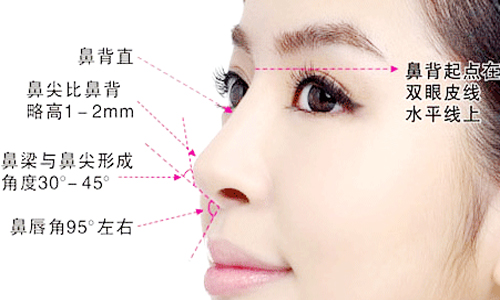 4、鼻面角,即鼻子与颜面的角度为理想为30-33度,我国很多女性低于30度。