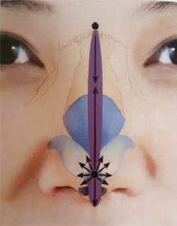 (3)鼻头:以鼻尖进针点为中心,贴大翼软骨行放射状注射,注射过多可能会造成整个鼻头的肥大而影响形态,重点应在鼻尖最高点的调整。