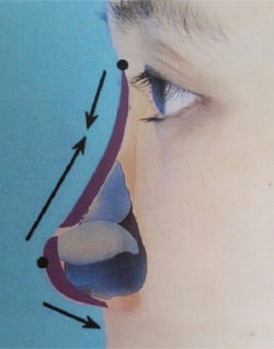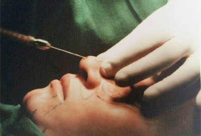 (1)鼻根:;两眉间黄金点稍上缘,约45°斜角进针,直接透过皮肤与肌肉进入骨膜上层,然后减小进针角度,贴骨膜上尽量向鼻头方向前行,右手行连续线状注射法将脂肪连续不断地注射在骨膜上,左手提捏鼻背部皮肤,边感受注射量边按捏塑形(图1)。