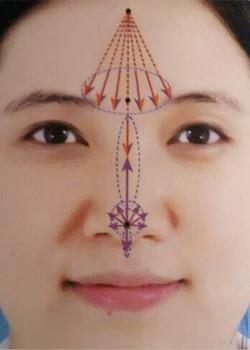 若患者同时行额部填充,可从额部中上切口处,使用长针头进行鼻根注射,鼻根部直线注射,印堂部可行多平面扇形注射,以形成鼻额角曲线(图2)。