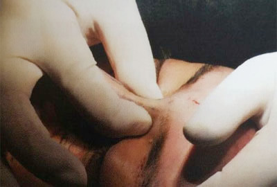 (9)抗生素软膏涂抹注射孔,术后立即冰敷以减轻肿胀。