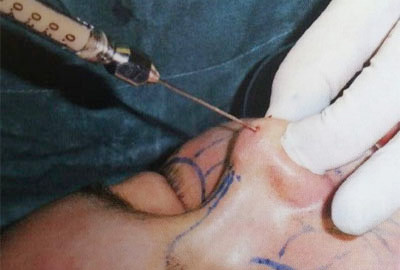 (5)在鼻头处取另一注射点,斜角进针紧贴软骨向鼻头方向潜行;