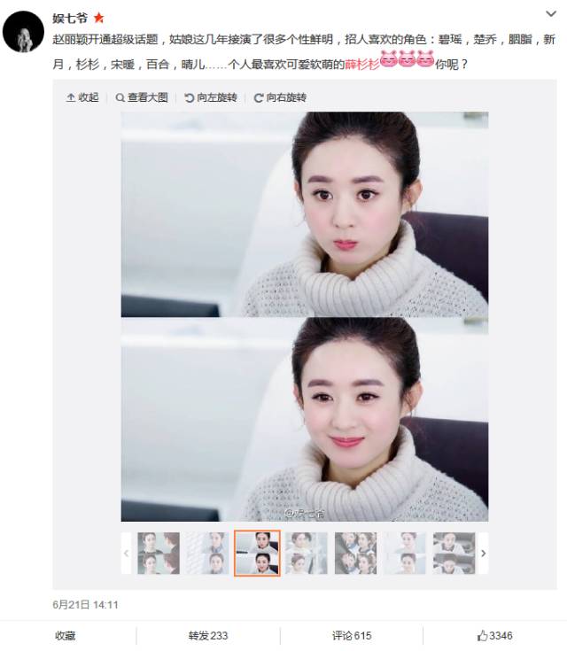 (转自新浪微博)这张可爱的圆脸给娱乐圈带来了不一样的女演员,不像其他女演员一样瘦的厉害,这样一张萌萌的圆脸简直小清新到不行!特别是在塑造薛杉杉这样的吃货形象的时候,简直就像是书里走出来的人!